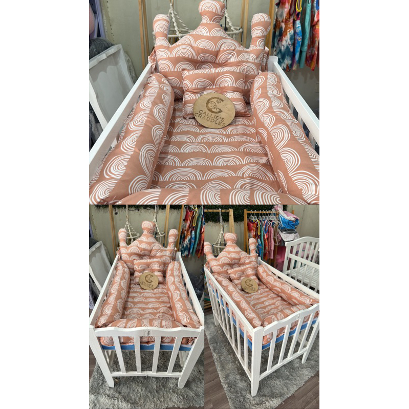 White adjustable crib with uratex and big bolster set rainbow themed Very well made.