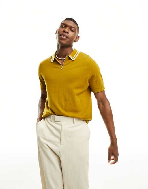 ASOS DESIGN knitted short sleeve zip top polo in mustard Very well made.