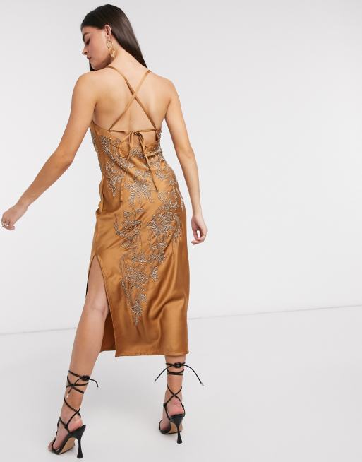 ASOS DESIGN satin embellished cowl slip dress with lace up back in Very well made.