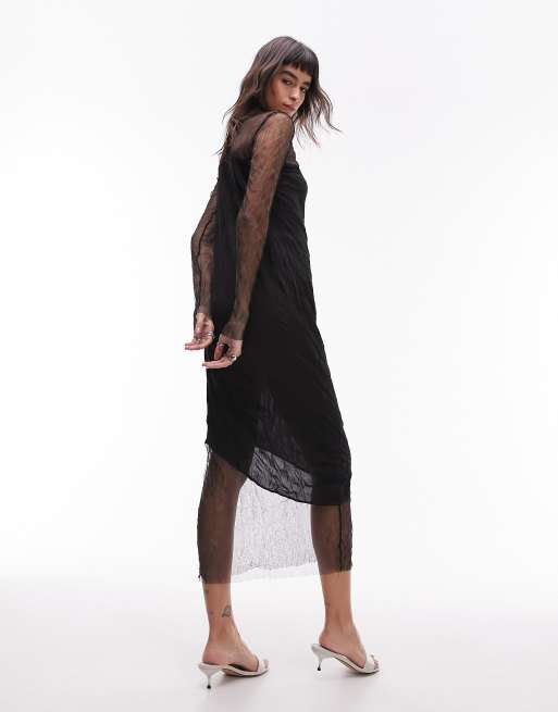 Topshop sheer and solid crinkle mix midi dress in black Very well made.