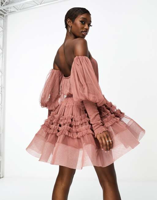 Lace Beads tulle bardot long sleeve mini dress in merlot Very well made.