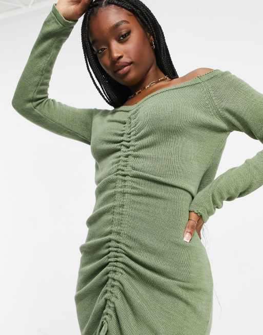 Fashionkilla knitted ruched detail off shoulder dress in khaki Very well made.