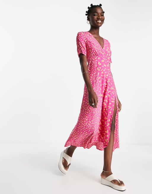 French Connection Bonita drape mixed printed midi dress in pink Very well made.