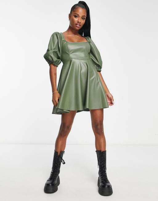 ASOS DESIGN Petite leather look babydoll mini skater dress in Very well made.