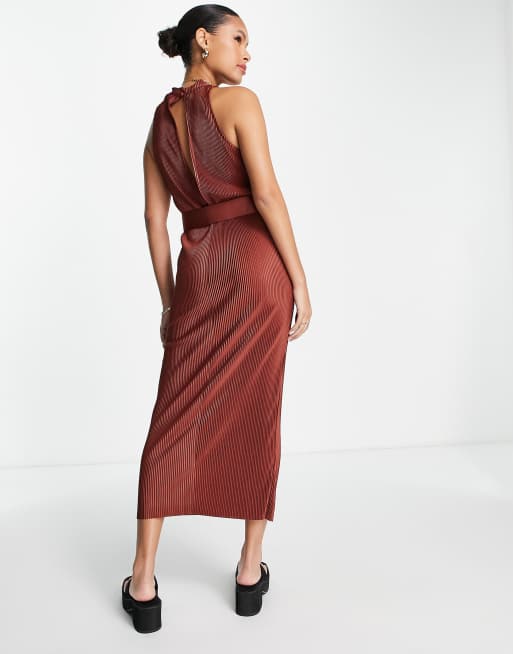 ASOS DESIGN plisse high neck sleeveless midi dress with belt in brown Very well made.