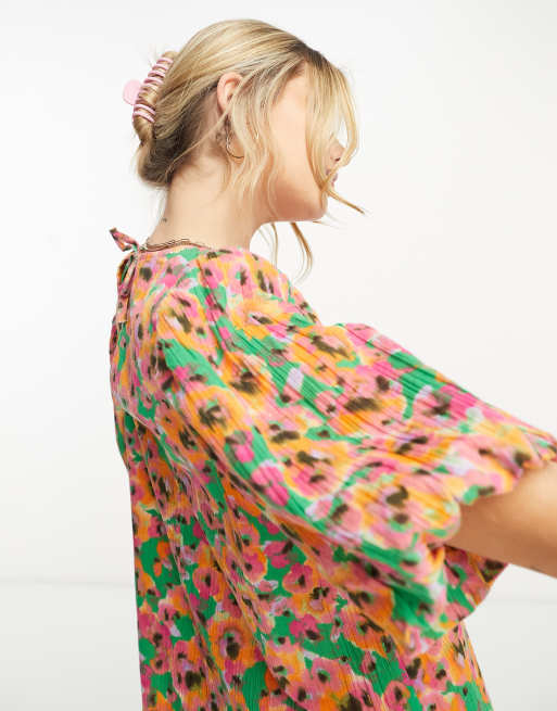 Monki seersucker puff sleeve midi dress in bright pink floral print in multi Very well made.