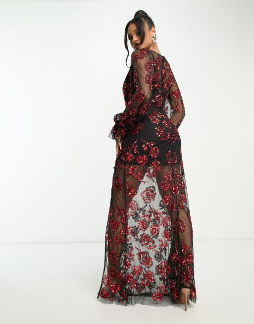 Lace Beads exclusive long sleeve maxi dress in red mixed applique Very well made.