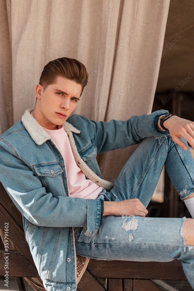 Glamour attractive young man in fashionable denim jacket in Very well made.