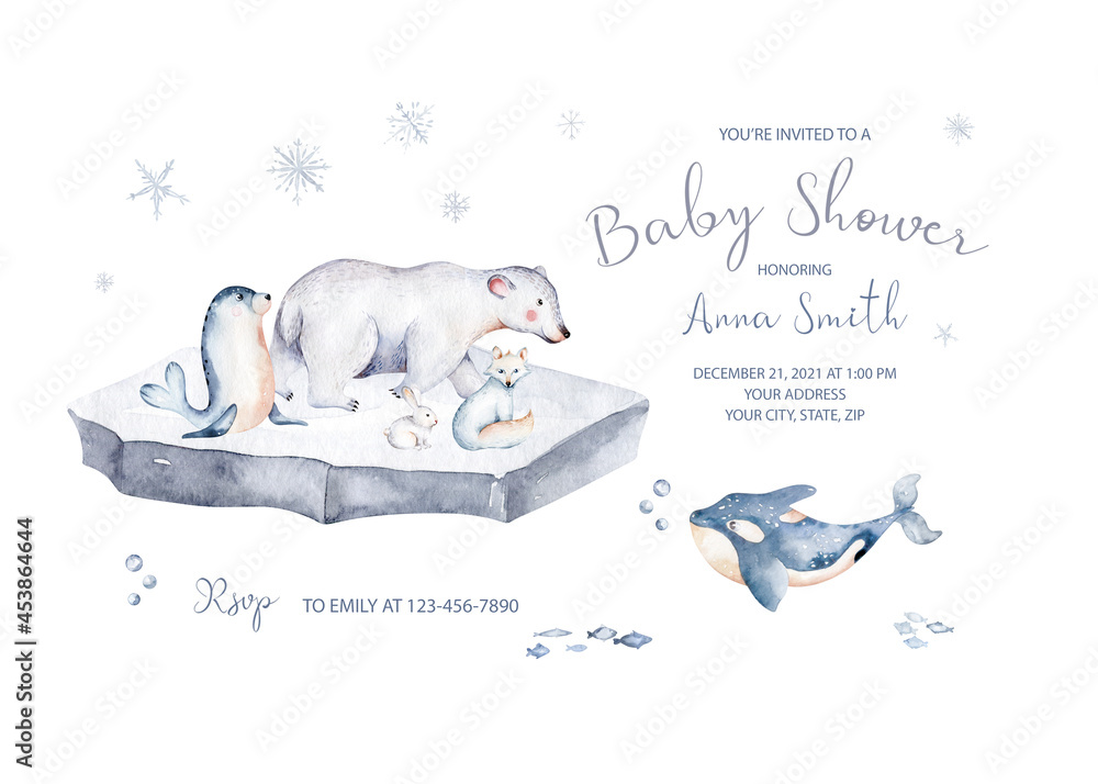 Baby shower invitation with polar arctic animals watercolor Very well made.