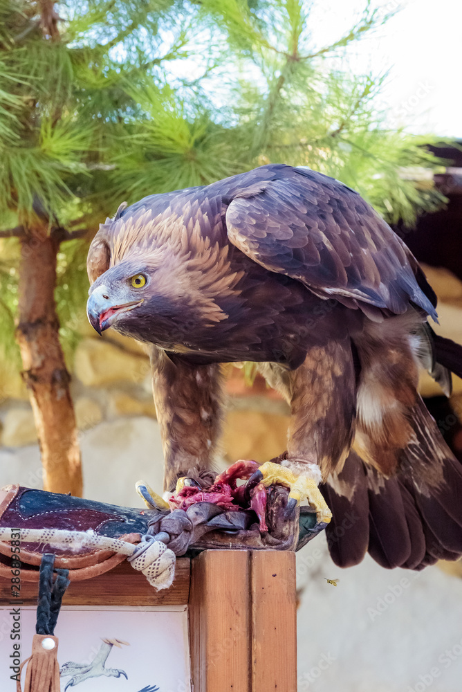 Beautiful mature golden eagle eating fresh meat. Raptor bird Very well made.