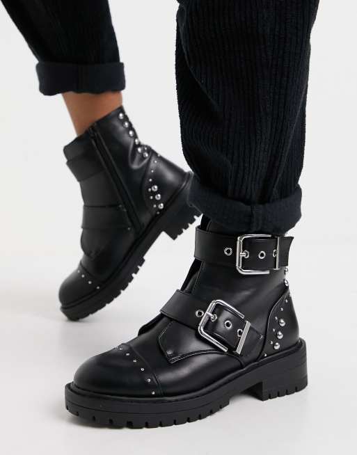Womens Black Stud Buckle Strap Biker Boots Flat Casual Winter Very well made.