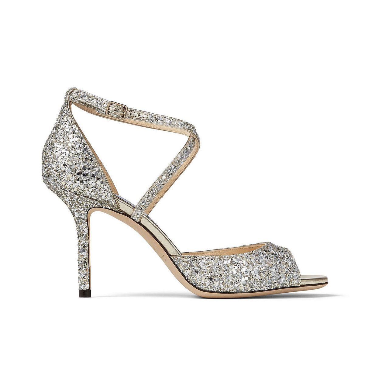 JIMMY CHOO Emily 85 Crisscross Heel Sandal Shadow Coarse Glitter Very well made.