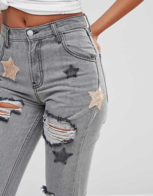 Mid Wash Sequin Distress Mom Jean Denim PrettyLittleThing Very well made.