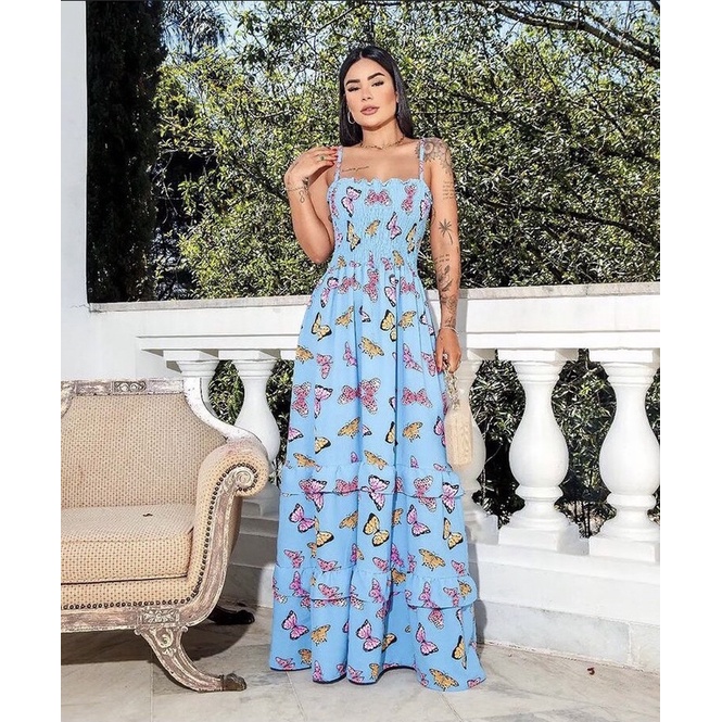 vestido longo e rodado cor azul com detalhes de borboletas Very well made.
