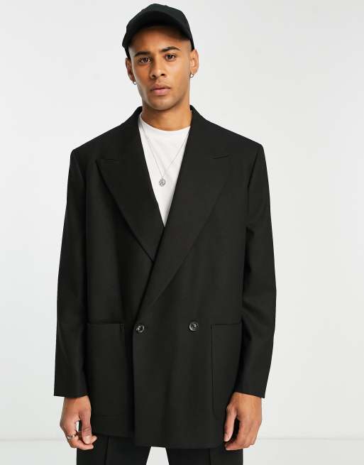 Topman double breasted oversized boxy pronounced twill suit jacket in black Very well made.