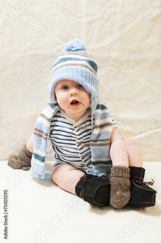 Cute baby boy wearing of warm knitted hat gloves Ugg boots Very well made.