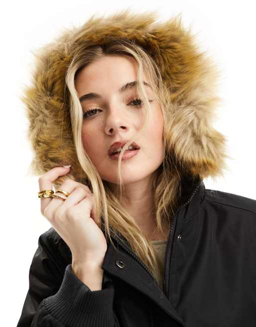 French Connection faux fur trim hood bomber jacket in black ASOS Very well made.