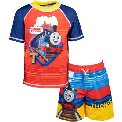Thomas Friends Tank Engine Toddler Boys Swim Rash Guard Swim Trunks Blue Red 2T Very well made.